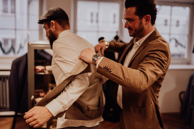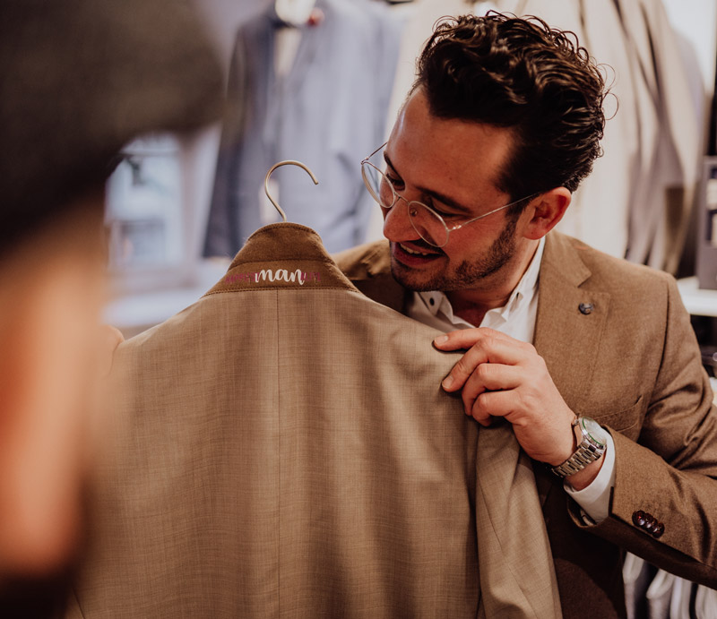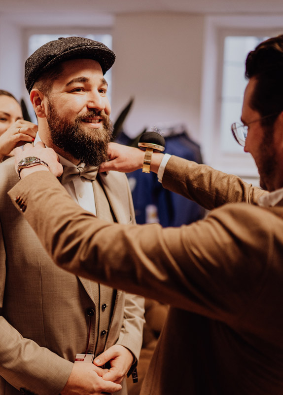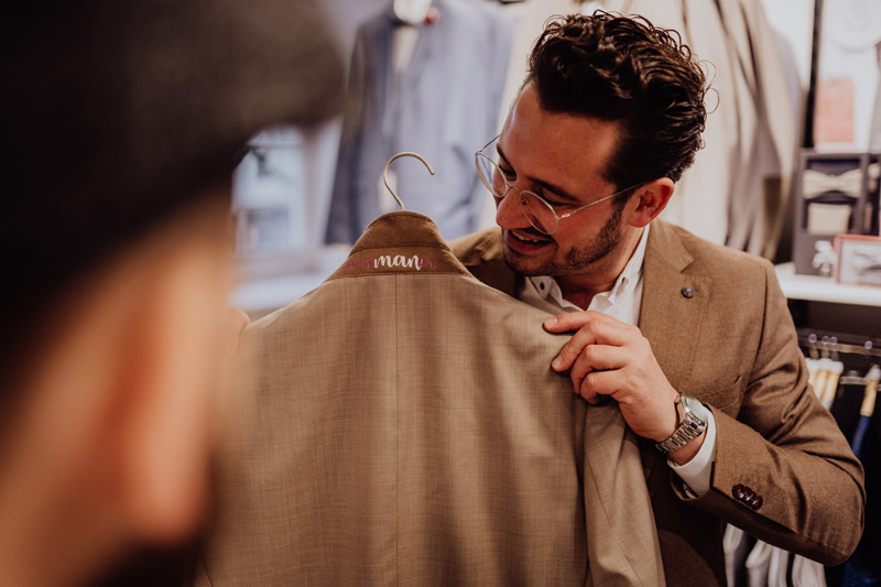 Maßanzug, kuratierte Auswahl, persönliche Beratung – für den Tag, der zählt. Mit Änderungsservice, Accessoires und einem Espresso in der Hand.